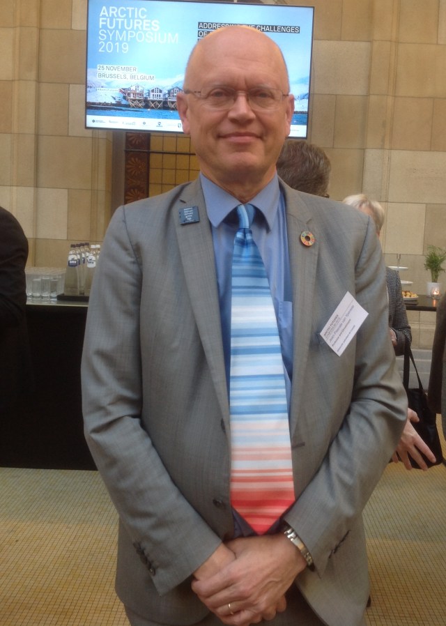 Professor Jean-Pascale van Ypersele from UCLouvain in Belgium is a former IPCC Vice-Chair, and co-author of the UN Global Sustainable Development Report 2019. At the Brussels symposium, he summed up the state of the science to the assembled “Arctic stakeholders, the EU community and the public,” illustrating it with his “warming stipes” tie, based on the now famous Ed Hawkins graph. If you had a version just for the Arctic, he noted, the hot colours would be even more prevalent.