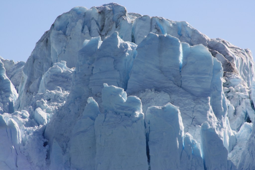 It’s an experience I will never forget, sitting by the fjord in Ilulissat, western Greenland, watching iceberg after iceberg drift down from the mighty inland ice sheet, floating into the sea, creating an ever-shifting panorama of bizarre shapes, changing colour in the summer Arctic light, from spectacular blue through shimmering silvery greys to shades of orange and pink in the light Arctic night. From a boat at the glacier front, I can hear the fizzing and crackling of a sea of ice chunks and fragments, the bang like a thunderclap when the glacier calves, releasing giant chunks of ice to the sea below and sending powdery clouds of icing-sugar snow into a blue sky sparkling with tingling ice crystals.